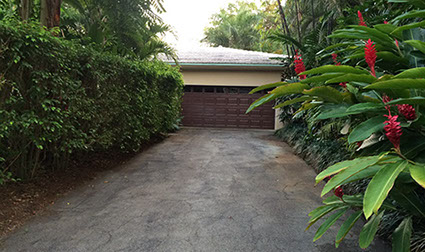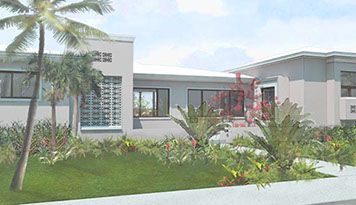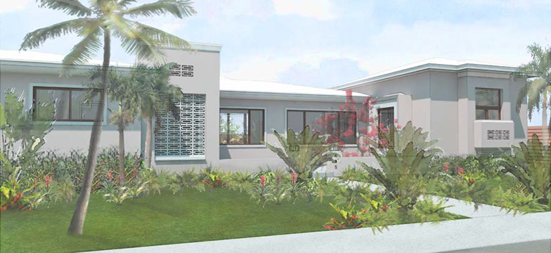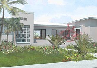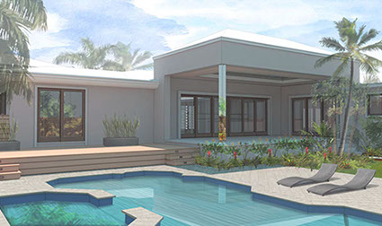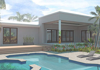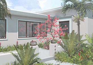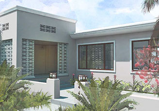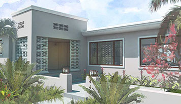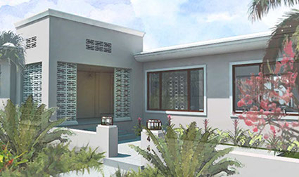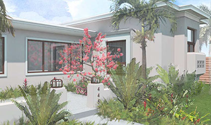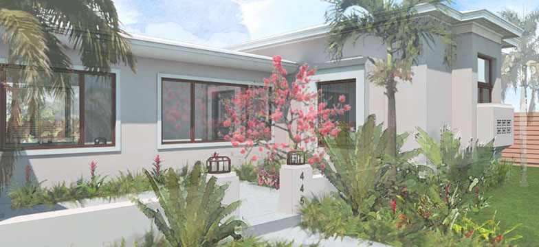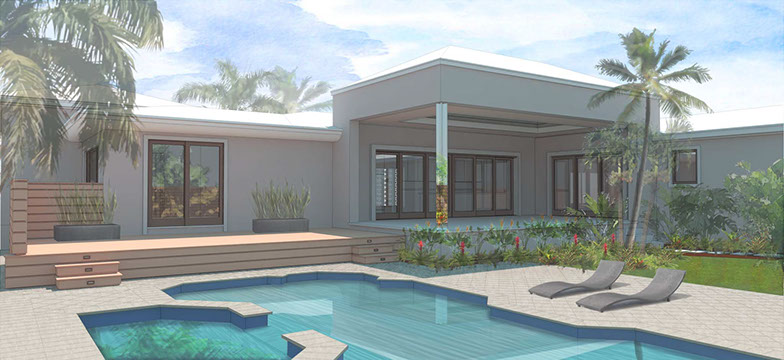 Existing horizontal planes complemented by new vertical volumes, combining to generate a landscape backdrop for the front garden and the pool deck. The new Master Suite projects forward on the east side of property with a broad overhang to shade its tall walls. Its roof projects further still to receive the projected window seat and balcony volumes which help maintain privacy. Towards the garden it extends once again to provide a work station with a view onto the garden. The front door is discovered by way of the new forecourt, and so the visitor follows and undulating path into the side of the new front porch, with a concrete breeze block that is parted to pull guests in. Once inside, an open plan stretches through the public areas of the house including a new open kitchen and family room, both of which open wide sliding glass doors onto a large new open-air back porch. There, at the threshold between inside and outside, widened for simultaneous outdoor living and dining, the tropical landscape remains unobstructed.